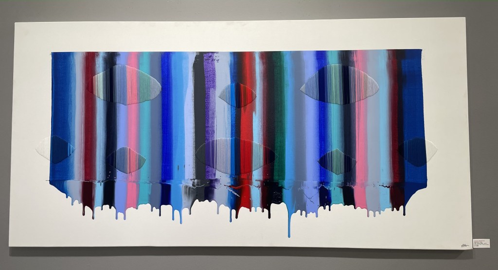 The first piece I’d like to discuss is Raul de la Torre’s Fils|Colors DLIII, a vertical scale of paint and fabric. On a large-scale canvas, the artist paints create a perfect rectangle within thick white barriers from the edge of the canvas to the middle. Approximately 34 long, straight streaks of paint make up the scale of color, encompassing various shades of blue, red, purple, black, and green. The streaks blend slightly, with some more so than the others, yet still maintain their colors’ integrity. Below the rectangle, the colors leak down in globs of paint, keeping their lines sharp and only slightly blended, contrasting the more blended and hand painted streaks above. Amid the rectangle are eight almond shapes made up of multicolored thread and which blends in perfectly with the paint. De la Torre used matching thread to replicate and replace the streaks of paint in these places, establishing a feeling of continuity between mediums. Each thread coordinates with its respective color below and above the thread as well as mirrors the blending of the paint by overlapping various colored threads, essentially creating an ombré effect. The artist’s expert color matching skills and seamless transition from paint to cloth shows his skill in two fields: painting and sewing.