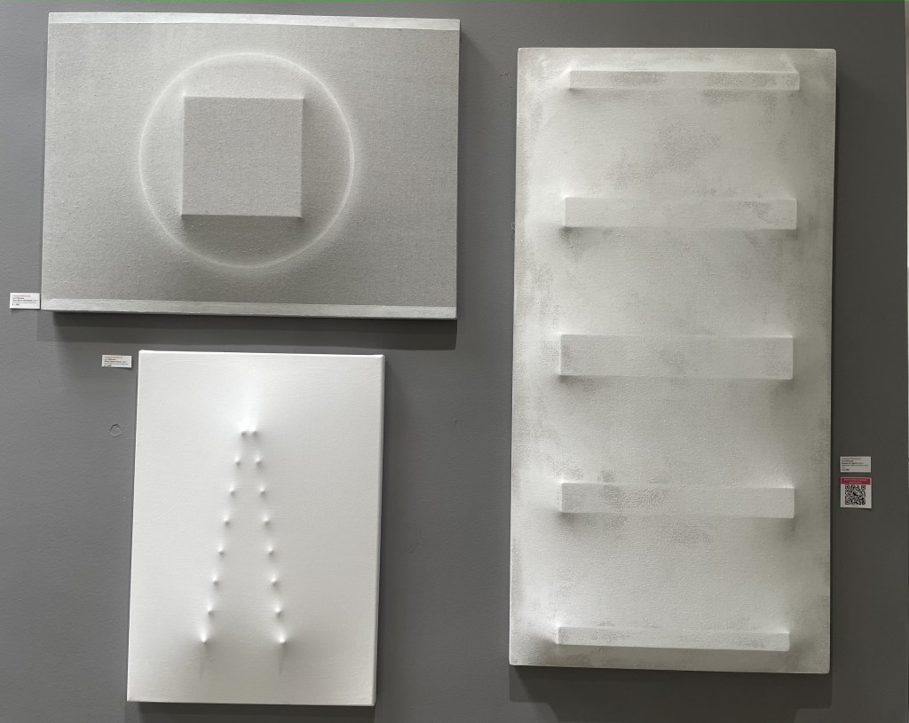 Similarly, Len Klikunas combines canvas fabric with geometric wooden structures to create eerie, 3D pieces. Pictured above are three of his works Ritual Object Pause, Gray Block with Bands, and Empire of Light B. The piece that stood out to me the most was the latter, a vertical canvas with five horizontal wooden planks protruding beneath the fabric. In the center is the largest and thickest plank with the others gradually and symmetrically becoming skinnier as they get nearer to the end of the piece. The planks create shadows and an uneasy feeling as if they are trying to escape. To add to this, the artist incorporates shading around the corners and across the canvas to create the illusion of a wall rather than an art piece. By centering his work around the structural impact of architecture and reducing that field down to five planks and one canvas, Klikunas imitates the look of a building in ruin.